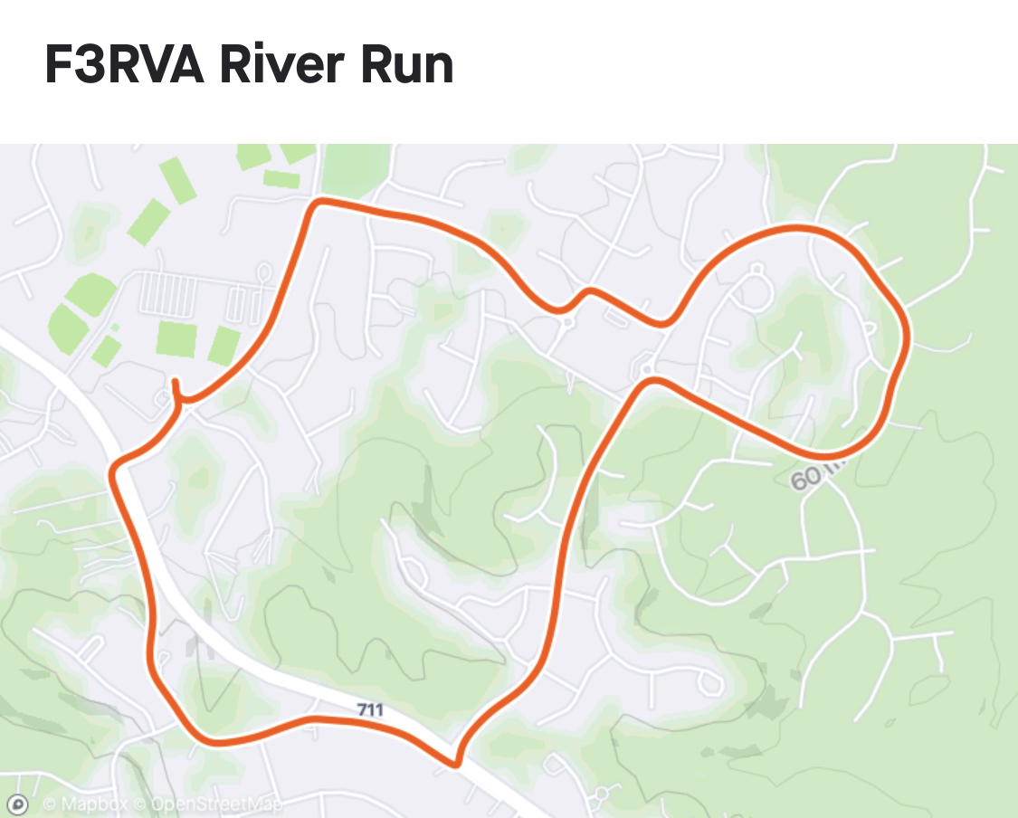 Three amigos posted to River Run to burn off some of those Fathers Day liquid calories. Nothing fancy here – just the OG Tarrington to Twin Team loop. On motion duly made, seconded, and unanimously carried, it was resolved to incorporate more routes down by the river at Robious Landing Park. The hills sucked this morning, but the sunrise was magnificent. Mr. Roper and his peloton whizzed by with some words of encouragement. Bullseye and YHC called it done at 4; Lugnut busted out another mile for 5.