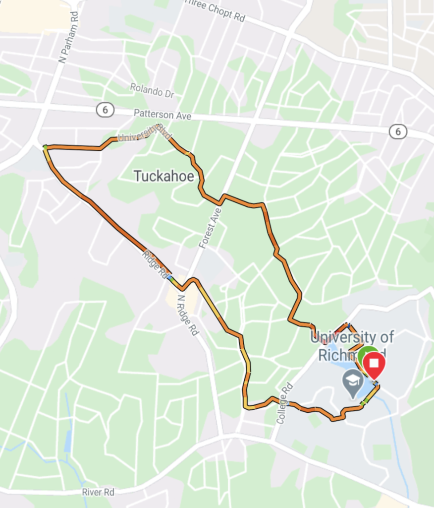 5 milers: 4 mile route but stay on University to Henrico (not Glendale), Ridge, Lakewood, Westham, Glen, Keller