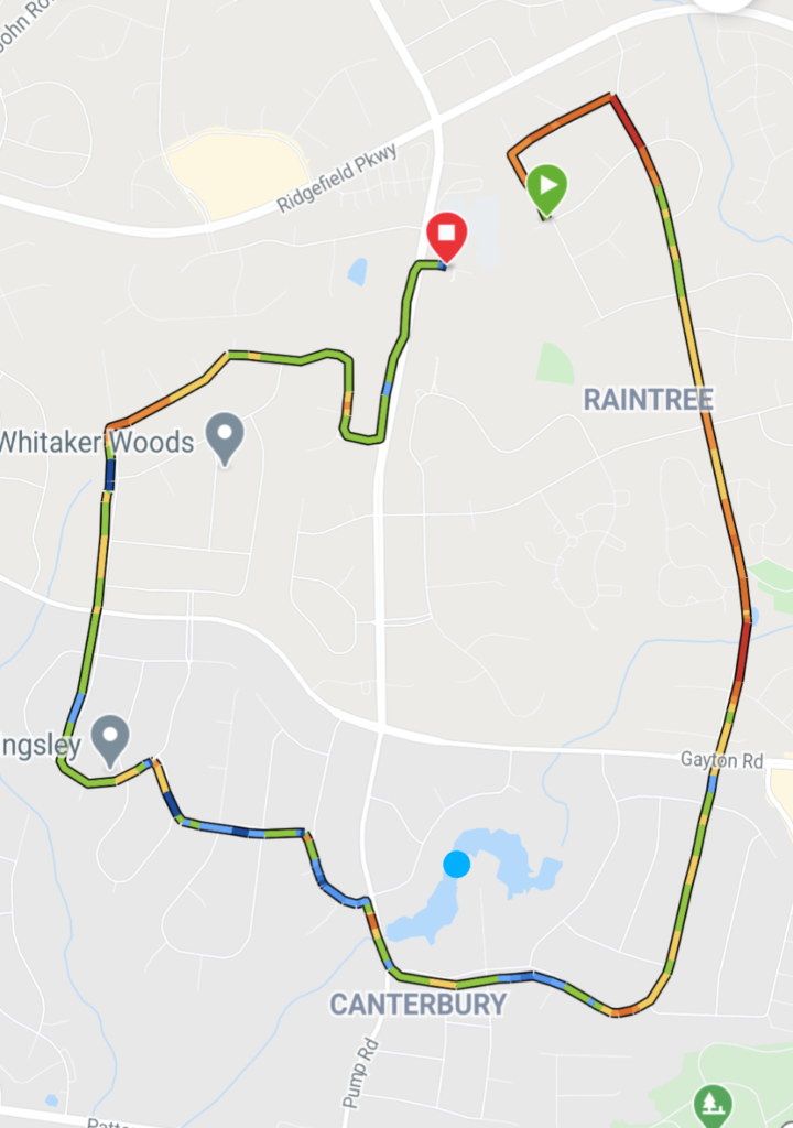 We did the Canterbury route which seemed a bit harder today than in the past – its a good mix of hills and with all the turns, tough to plan out to get exact but we will figure it out.