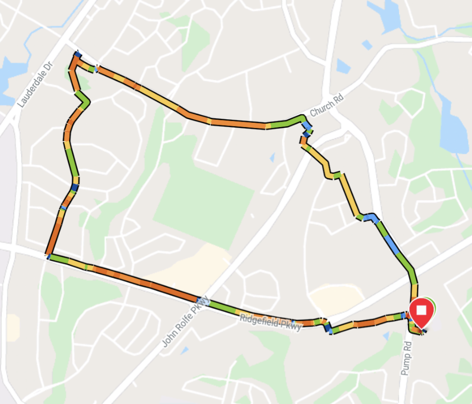 5mi route – Pump, Church to Gayton Elementary, through Pine Run and return on Ridgefield.