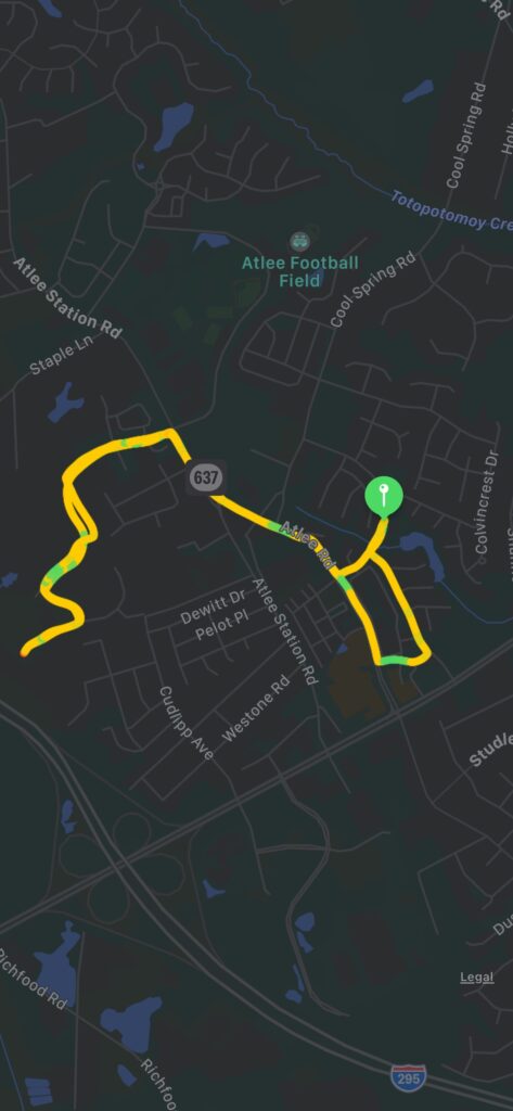 The 6.5 Mile route started with us and went right behind Atlee High School, down the access road to the CC trail into Honey Meadows, then into Kings Charter for the Farmhouse loop and returned to the Ruxton Club house. Hash and Spike ran this option.