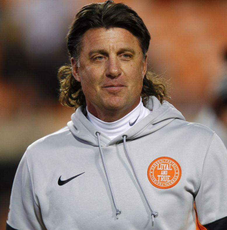 With everyone working out in a circle the mumble chatter was abundant. With our rockstar younger gents we quickly digress into Hair Nation…then hair…how some of us used to have it…mullets…then Mike Gundy just came out. No one can sport a mullet like him, or rather, he is the gold standard of mullets. Check out the pre-mullet video below and you can see why he grew one later. He defends his players like family.