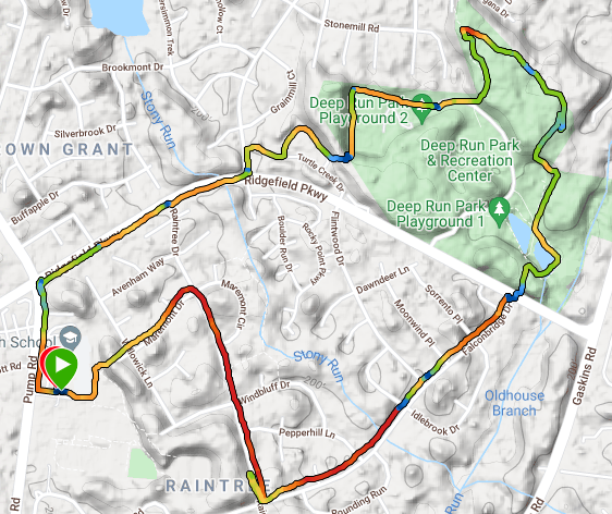 5 milers – Maremont, Raintree, Falconbridge, JRP, cut through apartments & townhomes, Flintwood, Falconbridge, Pump. 5.5