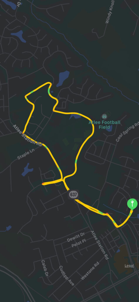 So this route we ran behind the Atlee, Chickahominy Middle school and Cool Spring elementary to go into Honey Meadows and then through the new neighborhood Taylor Farm then back towards Rutland with a Gile Neighborhood detour.