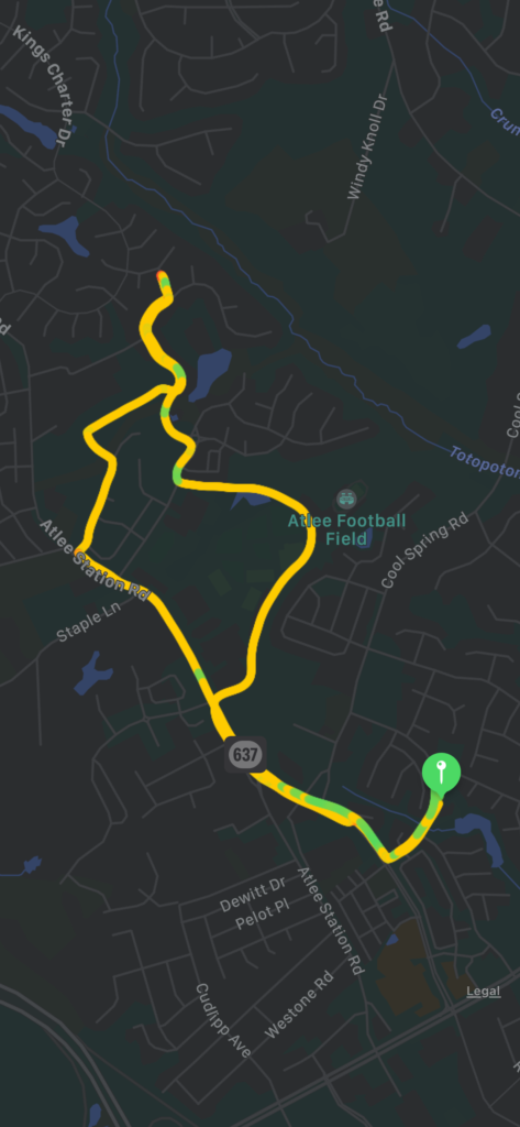 5 showed up for an nice cool run this morning and we took a route behind Atlee High School to Honey Meadows and we turned around at the Kings Charter short cut back through Taylor Farms to Atlee Station Road over the bridge to the Ruxton House for just over 5 miles. Hash ran extra through the Atlee XC trail.