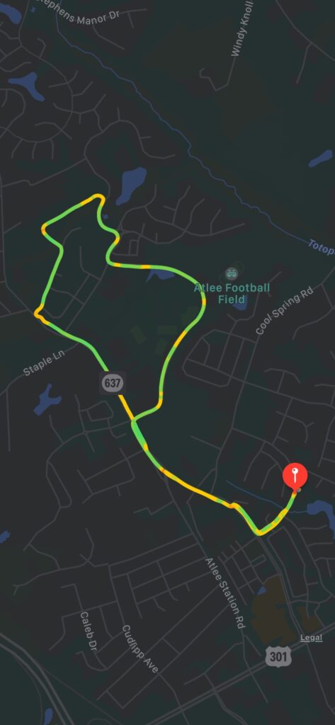 YHC pulled up to see a parked car that seemed like an FNG coming to a run workout. We had an easy 4 mile route, with Opus pulling in to park and Bulkhead running from home we gathered up made some introductions, fired up the headlamps and ran the following 4.25 mile route…typically called the Taylor farm loop. see route below: