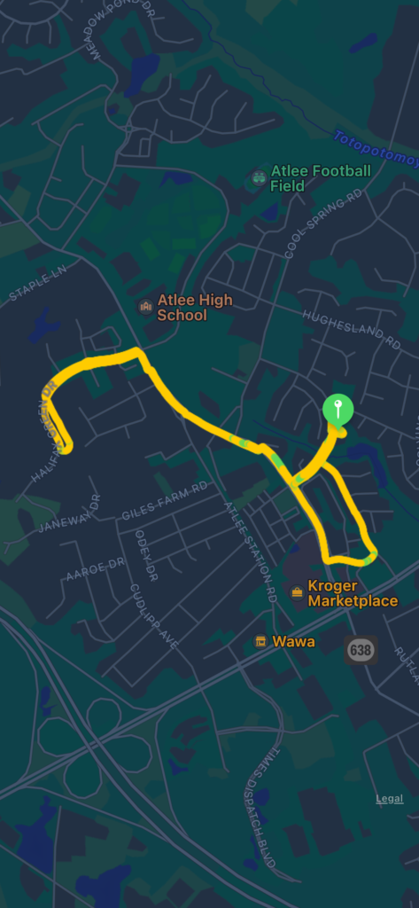 With no pre-thought out route, started with a reverse Bojangles loop to get the juices flowing, run over the train bridge and turn into Giles and do the loop near their clubhouse. Return back over the Sliding Hill Road Bridge run past the Rutland clubhouse and turn around to a large barking dog (a little shocked sprint) and backup to the intersection u-turn to clubhouse and mini loop there to complete 4 miles for this morning.