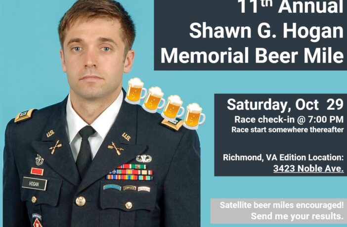 I invite the PAX to come out to the 11th Annual Shawn G. Hogan Memorial Beer Mile. For those that have not heard, Shawn was a very dear friend of mine and former college roommate of Handshake’s. Shawn lived a life of adventure and sadly he was killed in an Army training incident 11 years ago Shawn and I ran cross country in college and enjoyed beer. We always joked about running a beer mile one day, but sadly Shawn and I never got the opportunity to run one together. So every year around the time of his passing friends and family of Shawn get together to commemorate him with a beer mile.