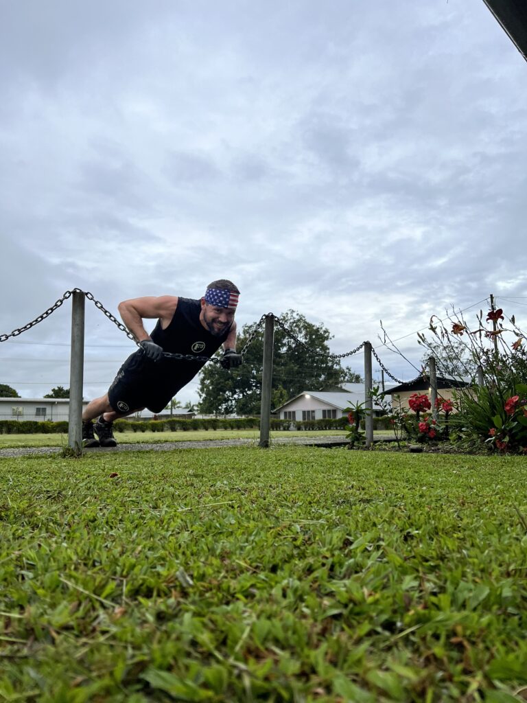 • Station 1 – Variable Upper Body exercises – such as alternating incline merkins and dips on the swinging chain fence, burpee broad jumps, polar bears, walking Lt Dan’s, etc