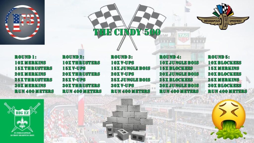 8 IronPAX enthusiasts gathered at Satan’s Hill this morning to take a turn at the Cindy 500. With a soundtrack from the 90s, this is how it went down: