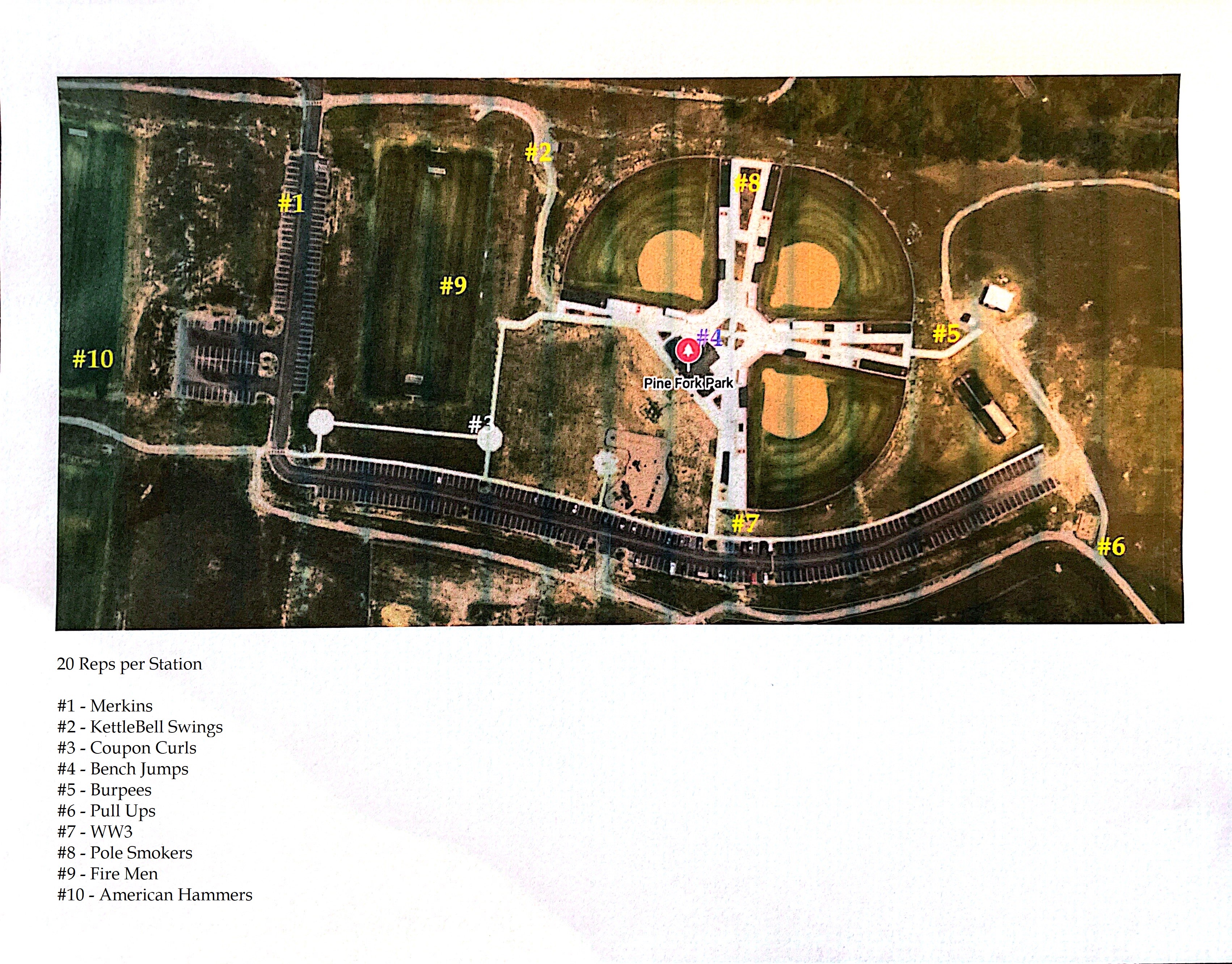 2 Laps – 20 reps per station, Station 9 is 5 reps. 5k of running.