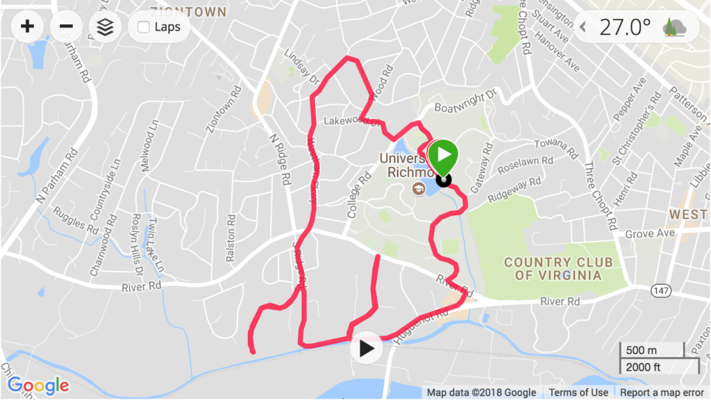 Option 1 – The goal was a negative split. Run out 23 minutes, turn around and get back to the start in 22 minutes. The intent is to go out at a normal pace then try to pick it up on the return. Negative splits are a good goal during any run/race as you get faster throughout the run, rather than slowing down towards the end.