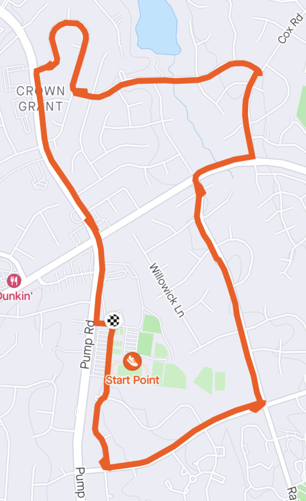 Route today was : Old Prescott, Right on Glen Eagles, across the apartments and gas station to Old Pump, then Right on Three Chopt for 5mi or Right through the Short Pump Park for 5.5mi, then Right on JRP and return to the flag.