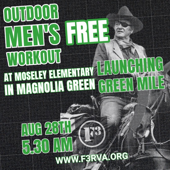 Calling all Moseley (and beyond) men! Are you a “chubby hubby” looking to burn off some extra pounds? Spouses, you can be honest with him, he probably needs to hear it. Or maybe you think you are a beast and do CrossFit or “go to the gym”… ok let’s see what you got! Well – F3 RVA is coming to location near you on Wednesday starting Wednesday August 28, 2024 at 5:30 a.m. at Moseley Elementary school. Not sure what F3 is? F3 is an international nonprofit whose mission is to plant, grow, and serve small workout groups for men…