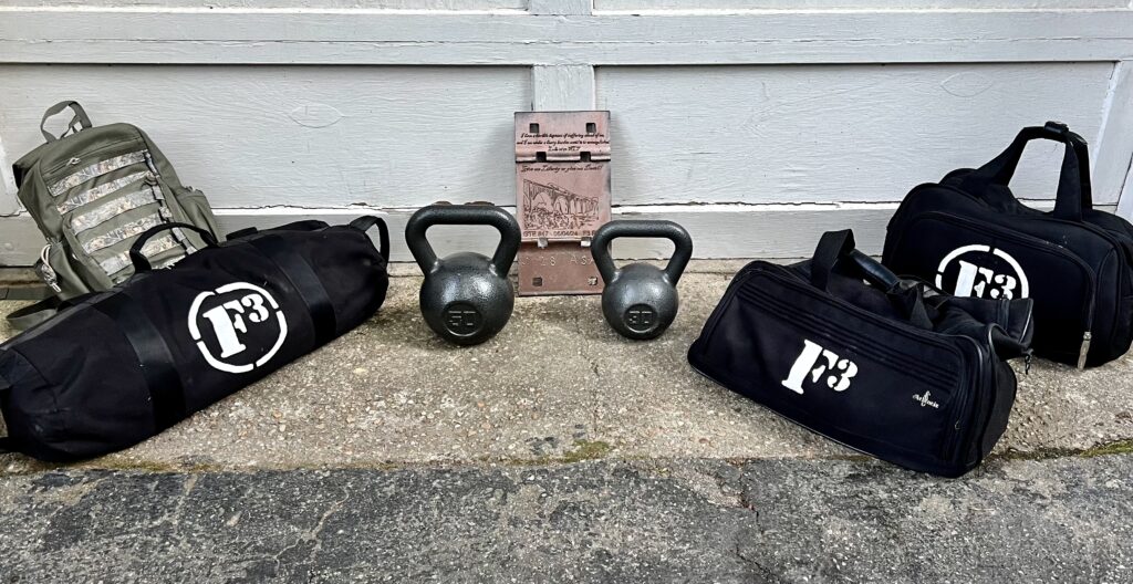 - Each member of the PAX directed to collect a unique heavy item – the options were: 40# GTE team weight (rocks in a duffle), 60# sandbag, 30# ruck, 50# kettlebell, 25# metal track plate, another #40 GTE team weight, 30# kettle bell